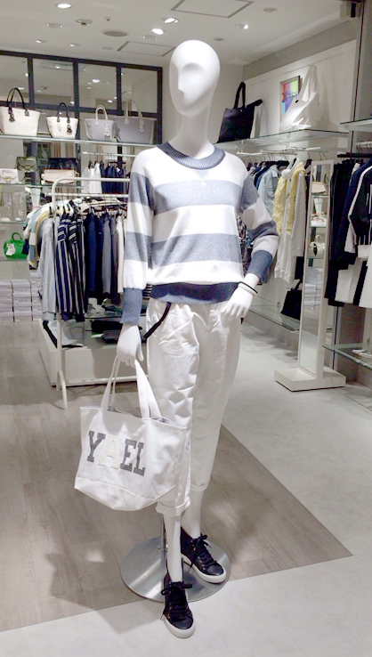 幅広のリブ編み、太ボーダー、ラグラン袖と、スポーツテイストのデザインを